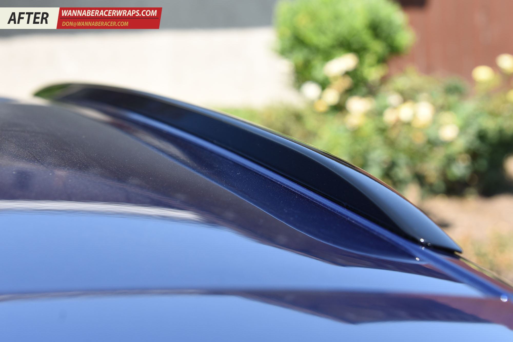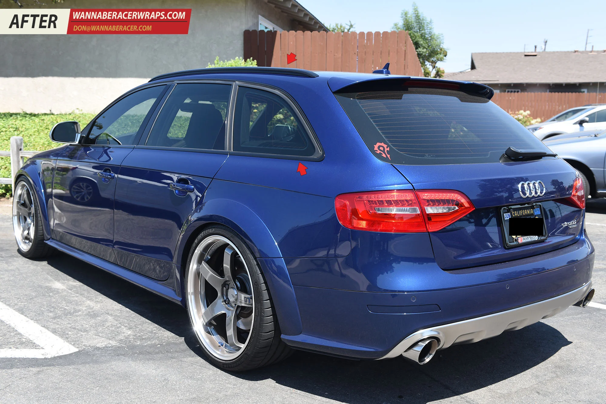 To help clean up the chrome on this blue Audi Allroad, we blacked out the chrome window trim and roof rails with 3M 1080 gloss black vinyl wrap. Getting rid of the chrome around the windows and on the roof really cleaned up the look of this blue Allroad and gave it a more aggressive overall look. As you can see, some other pieces on the car were still kept chrome/sliver, which gave the car a good overall balance that complimented the finish of the wheels nicely. The owner of this car was in Santa Monica Los Angeles and we went out to them to do the wrap work.
